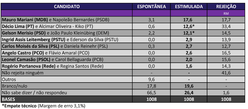 Com a apresentação dos nomes dos candidatos ao governo agora registrados, Mauro Mariani lidera em números, com 17,6% das intenções de voto dos eleitores. Estatisticamente empatam Décio Lima e Gelson Merísio, com 12,6% e 12,1% dos votos, respectivamente. Brancos, nulos e indecisos somam 46% do eleitorado, neste momento.