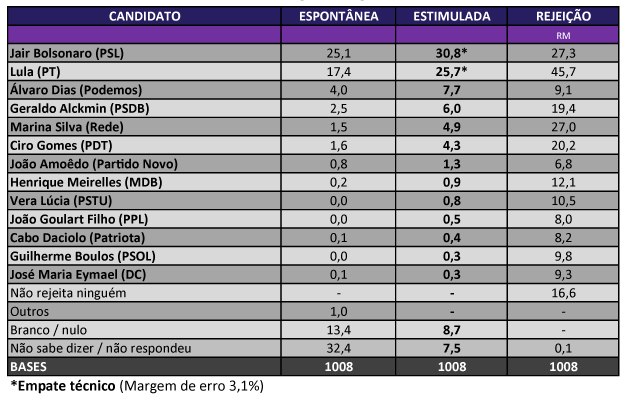 A soma de brancos, nulos e indecisos já é relativamente pequena neste estado (16%). De forma espontânea, Bolsonaro e Lula também são os mais citados (25,1% e 17,4%, contra 4% do candidato mais citado espontaneamente a seguir, Álvaro Dias), embora cerca de um terço dos eleitores ainda não saibam apontar de forma espontânea em quem votariam. O nome mais rejeitado no estado para a presidência é o de Lula (45,7%). A seguir, Bolsonaro e Marina empatam cada um com 27% de rejeição.