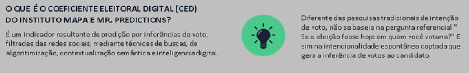 Observações: O método Coeficiente Eleitoral Digital – CED é o mesmo que prognosticou a vitória de Trump (EUA-2016), Marito (Paraguai-2018) e a ida de Aécio ao segundo turno contra Dilma (Brasil-2014).