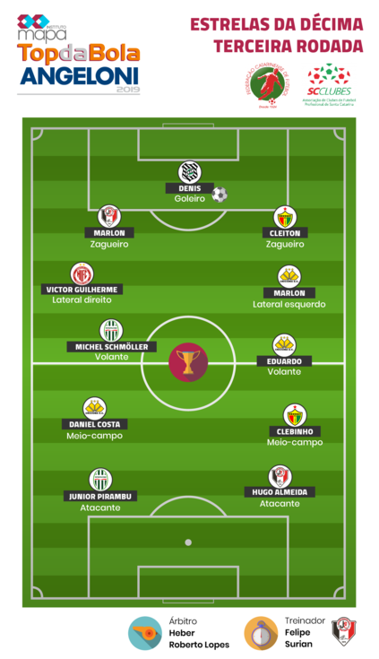 O Instituto Mapa, junto a Federação Catarinense de Futebol, a Associação dos Clubes de Futebol Profissional de Santa Catarina e patrocínio do Grupo Angeloni, divulgam a seleção da quarta rodada do Prêmio Top da Bola, referente a primeira fase do Campeonato Catarinense Sicoob Série A 2019.