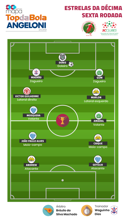 O Instituto Mapa, junto a Federação Catarinense de Futebol, a Associação dos Clubes de Futebol Profissional de Santa Catarina e patrocínio do Grupo Angeloni, divulgam a seleção da quarta rodada do Prêmio Top da Bola, referente a primeira fase do Campeonato Catarinense Sicoob Série A 2019.
