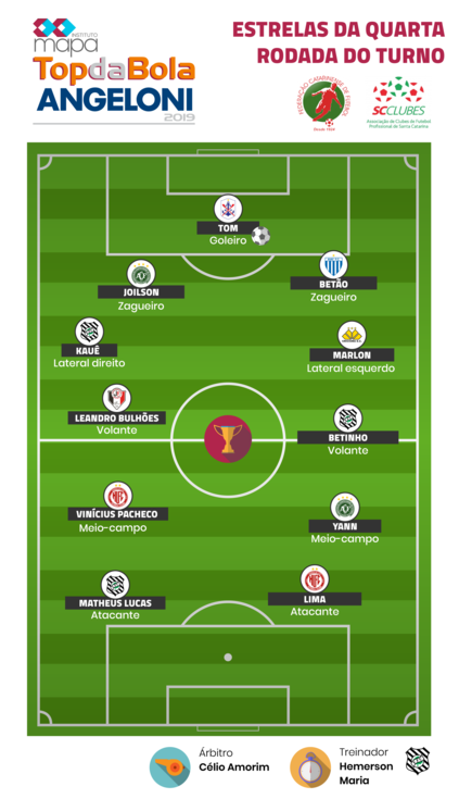 O Instituto Mapa, junto a Federação Catarinense de Futebol, a Associação dos Clubes de Futebol Profissional de Santa Catarina e patrocínio do Grupo Angeloni, divulgam a seleção da quarta rodada do Prêmio Top da Bola, referente a primeira fase do Campeonato Catarinense Sicoob Série A 2019.